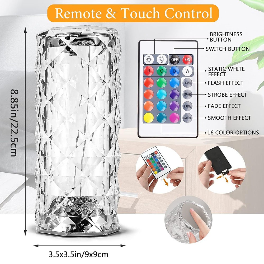 Elevate your space with the Crystal Diamond Table Lamp, a mesmerizing blend of elegance and functionality. Designed with a stunning 3D diamond-cut acrylic surface, this lamp projects a breathtaking rose-shaped light pattern, creating a romantic and luxurious ambiance for your bedroom, living room, or workspace.