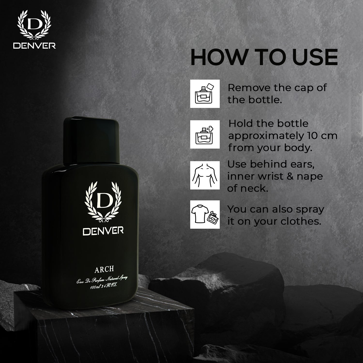 Denver Arch Perfume (100ml): This fragrance is designed to awaken your bold side, allowing you to conquer the night. It features a blend of musk, cardamom, and amber, creating a woody and provocative scent. The bottle's design reflects the mysteries of the night, alluding to a seductive atmosphere.
