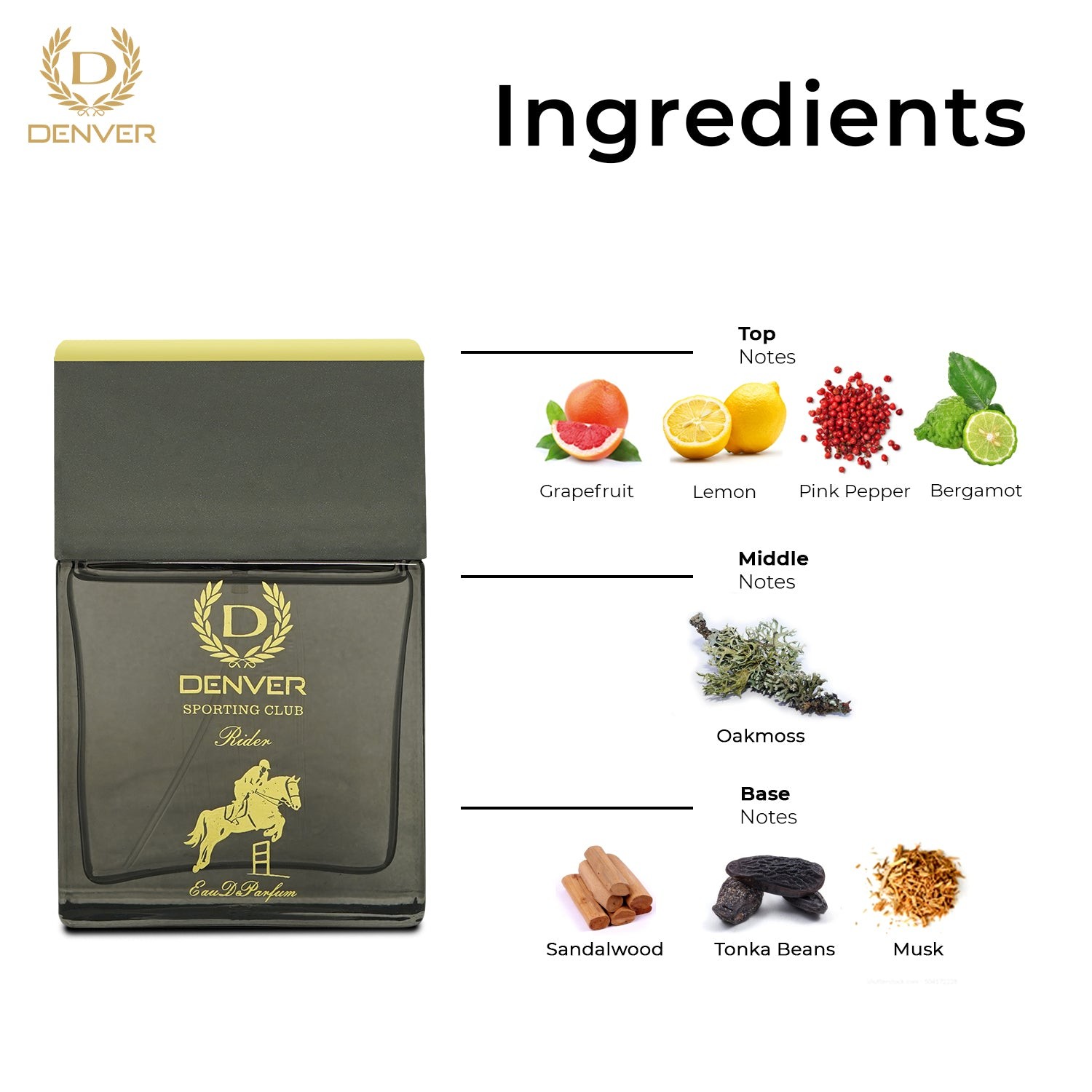 Rider 60 ml: Rider begins with the sparkling freshness of grapefruit, bergamot, and lemon. The heart reveals rich florals and oakmoss, while the base notes of sandalwood, tonka beans, and musk provide a modern, authentic fragrance.