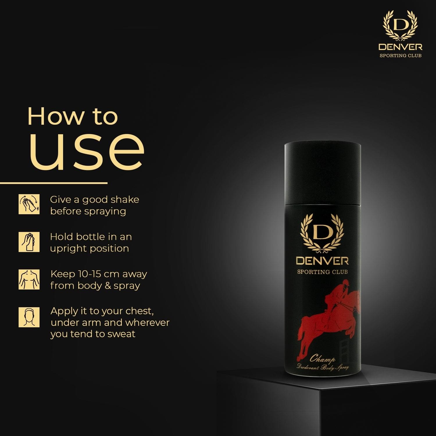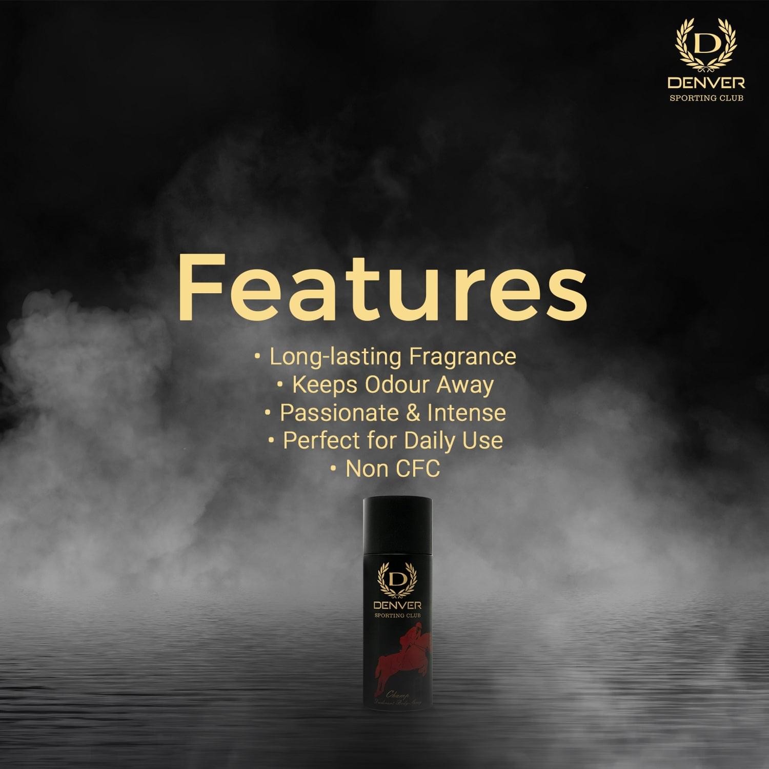Denver's Champ Deodorant Body Spray is a 200 ml fragrance designed for men, offering a fresh, masculine scent with woody and citrus aromatic notes. It's crafted to boost confidence and embodies a champion's spirit.