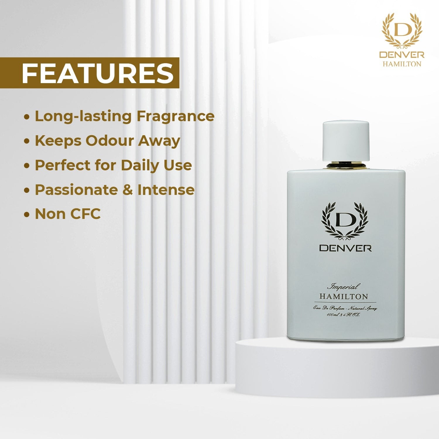 Denver's Imperial Perfume is a sophisticated fragrance crafted for men, offering a fresh and sensual blend of notes. It opens with the juiciness of grapefruit, leading to middle notes of rose, cinnamon, and spices, and concludes with a base of woody, musky, and amber tones.