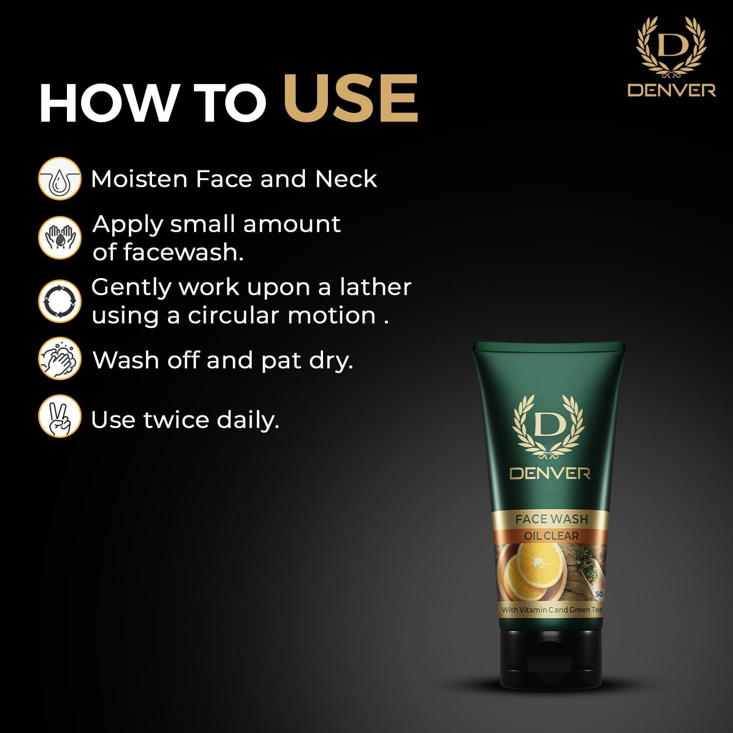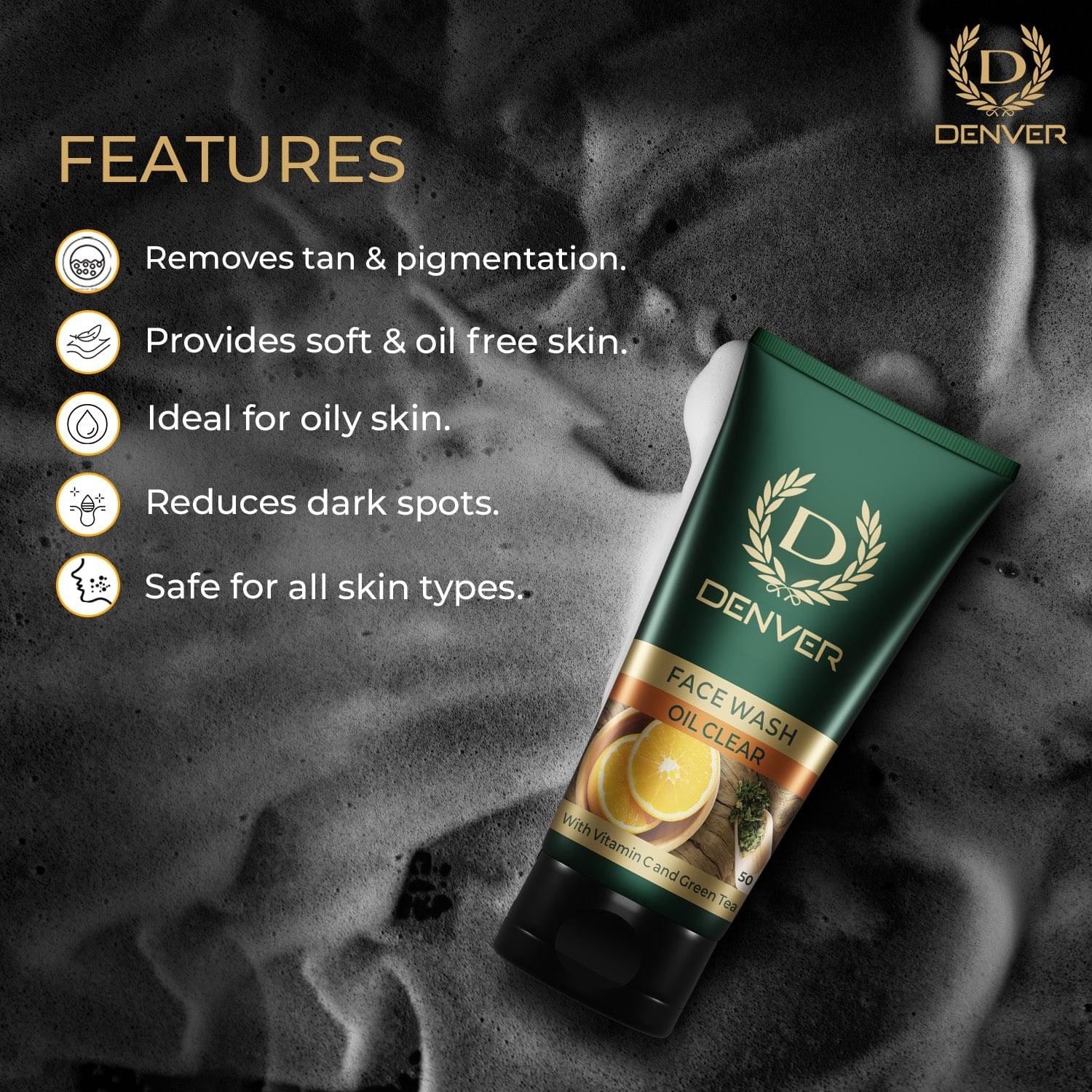 The Denver Oil Clear Face Wash is a men's skincare product formulated to control excess oil production and prevent acne breakouts. Enriched with Vitamin C and Green Tea, it cleanses the skin, removes dirt and impurities, and leaves a refreshed, matte finish. Suitable for all skin types, this face wash is dermatologically tested and free from parabens, soaps, TCC, and triclosan.