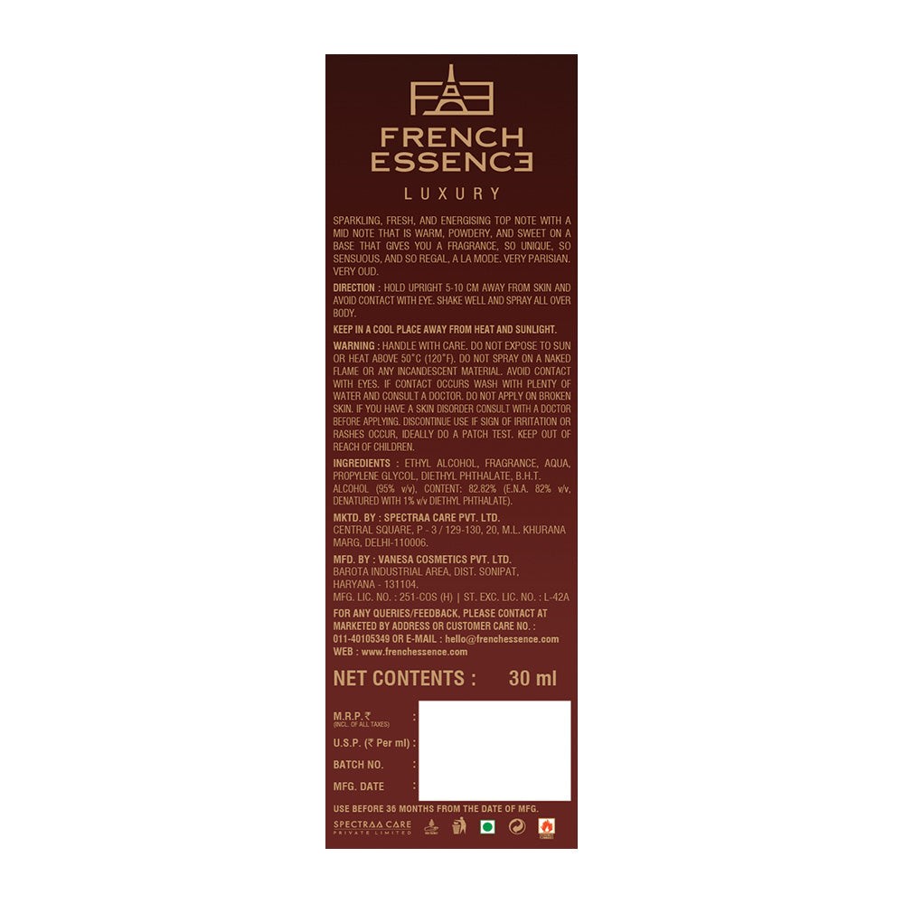 The Oud Men's Luxury Perfume by French Essence is a sophisticated fragrance designed for the modern man. It opens with top notes of saffron and lavender, leading to a heart of agarwood. The base notes of oud, musk, and patchouli provide a warm, sensual finish. This blend creates a rich, attention-grabbing scent that lasts all day.