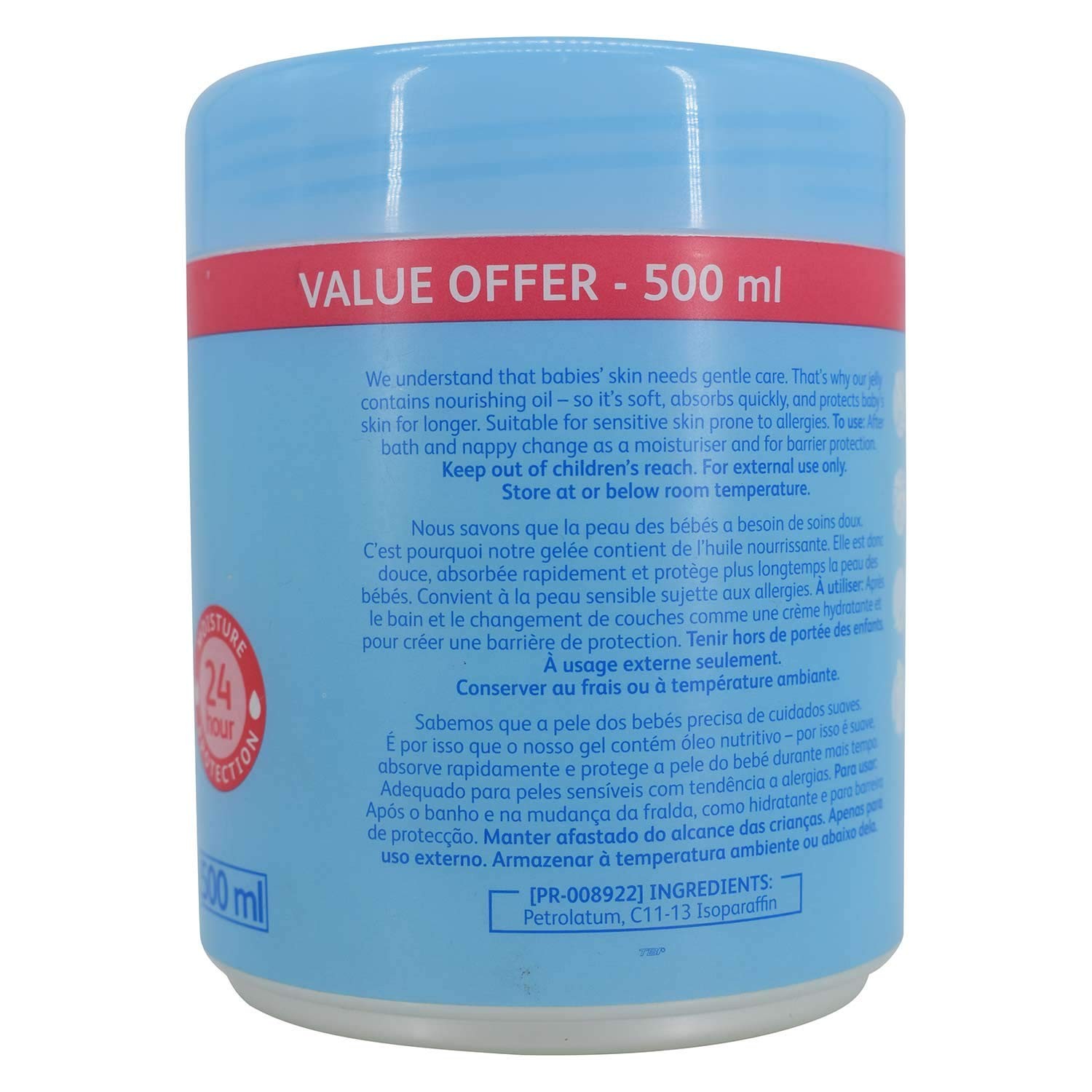 Johnson's Baby Jelly Fragrance-Free 500ml is a gentle and moisturizing petroleum jelly designed to protect your baby's delicate skin. It helps prevent dryness by locking in moisture, keeping the skin soft and smooth. This fragrance-free formula is ideal for sensitive skin, reducing the risk of irritation. It can be used to soothe dry patches, provide a protective barrier against wetness, and help prevent diaper rash. Dermatologically tested, hypoallergenic, and safe for daily use.