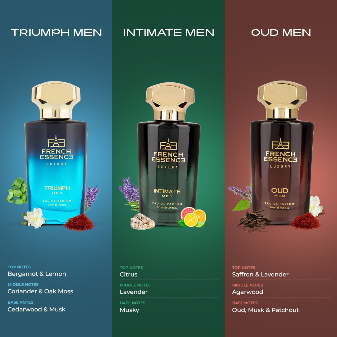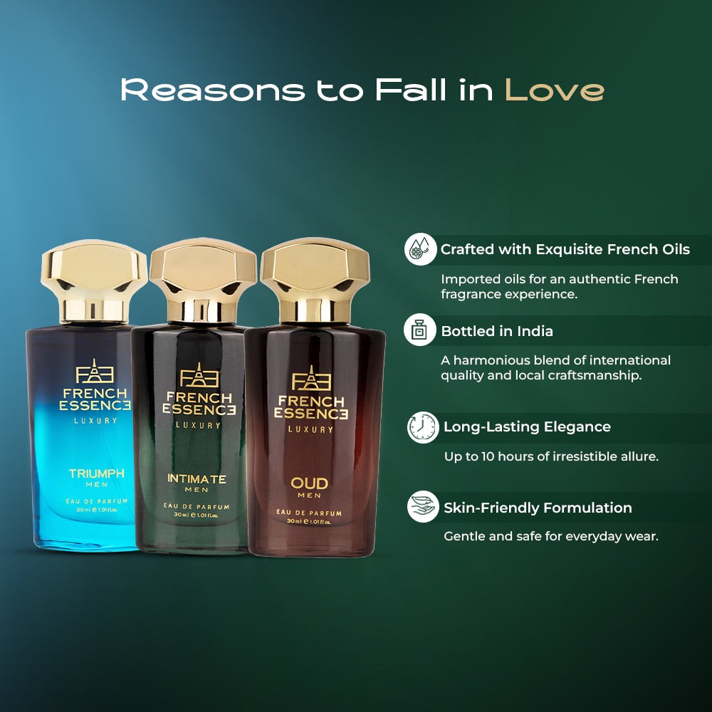 Introducing the French Essence Men Luxury Perfume Combo Pack – a trio of refined fragrances that exude confidence, intimacy, and sophistication. Each 30ml bottle in this luxurious collection enhances your personal style with Men Triumph, Men Intimate, and Men Oud.