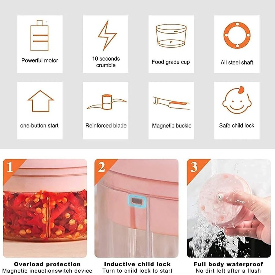 The Mini Portable Electric Chopper is a compact and efficient kitchen gadget designed for effortless chopping, mincing, and cutting. Powered by a USB-rechargeable battery, this portable tool allows you to easily chop fruits, vegetables, and other soft ingredients without the hassle of manual effort. Its small, lightweight design makes it perfect for travel, picnics, or small kitchens, while its BPA-free construction ensures safety and health-conscious use. Ideal for quick meal prep, this chopper is not recommended for hard products like nuts or bones. Experience convenience and efficiency with this easy-to-use chopper, perfect for anyone looking to simplify their cooking tasks.
