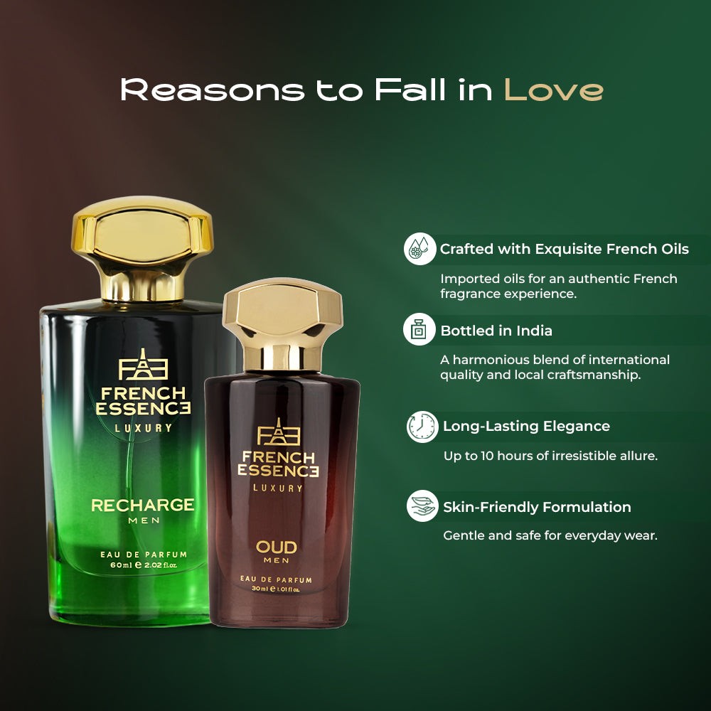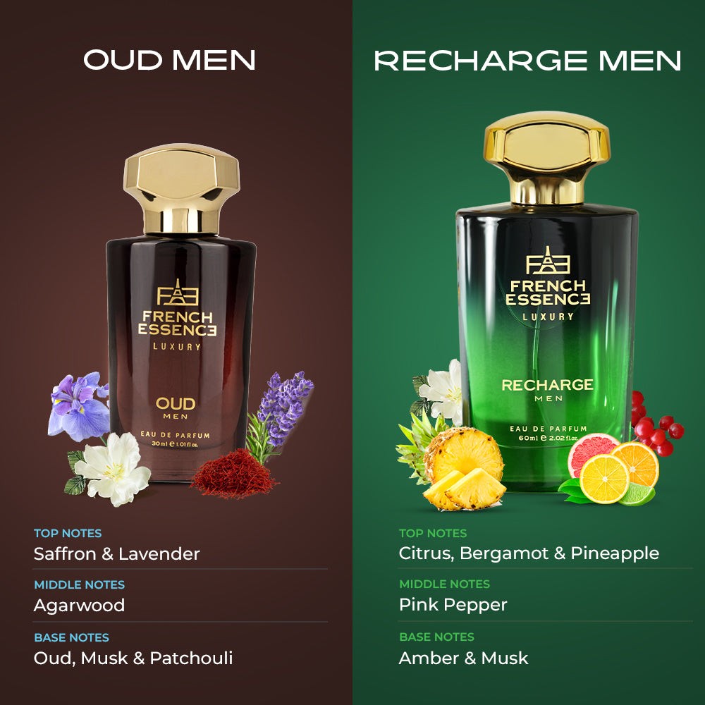 A combination men's fragrance by French Essence exudes sophistication and refinement. This captivating scent opens with fresh, citrusy top notes of bergamot and grapefruit, providing an invigorating burst of energy. The heart of the perfume features a blend of aromatic lavender, spicy nutmeg, and warm, earthy vetiver, creating a balanced and enduring essence. The base notes are a rich fusion of sandalwood, amber, and leather, adding depth and sensuality to the composition. Ideal for the modern man who seeks a versatile and elegant scent, this perfume is perfect for both daytime wear and evening occasions, leaving a lasting impression with its bold, yet subtle appeal.