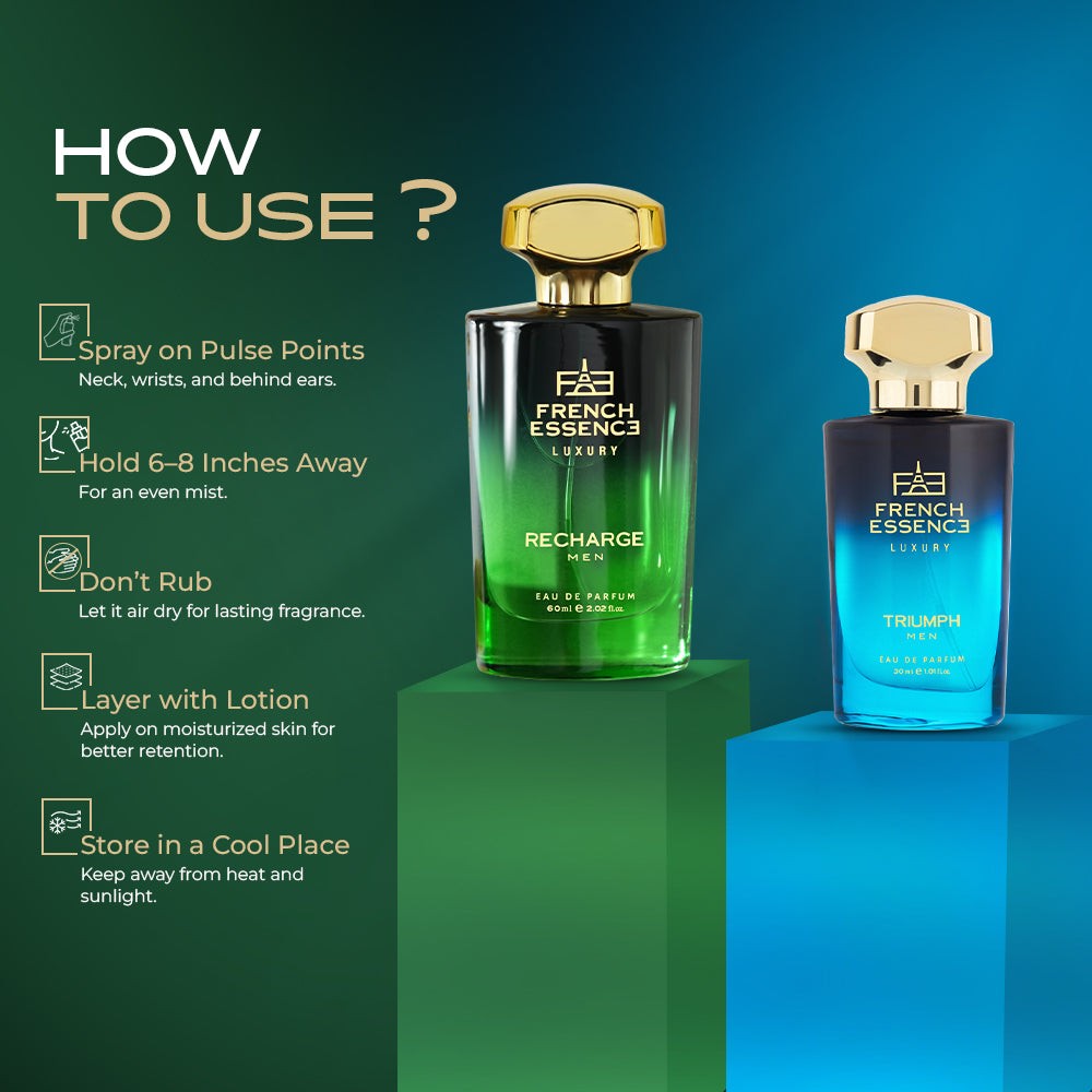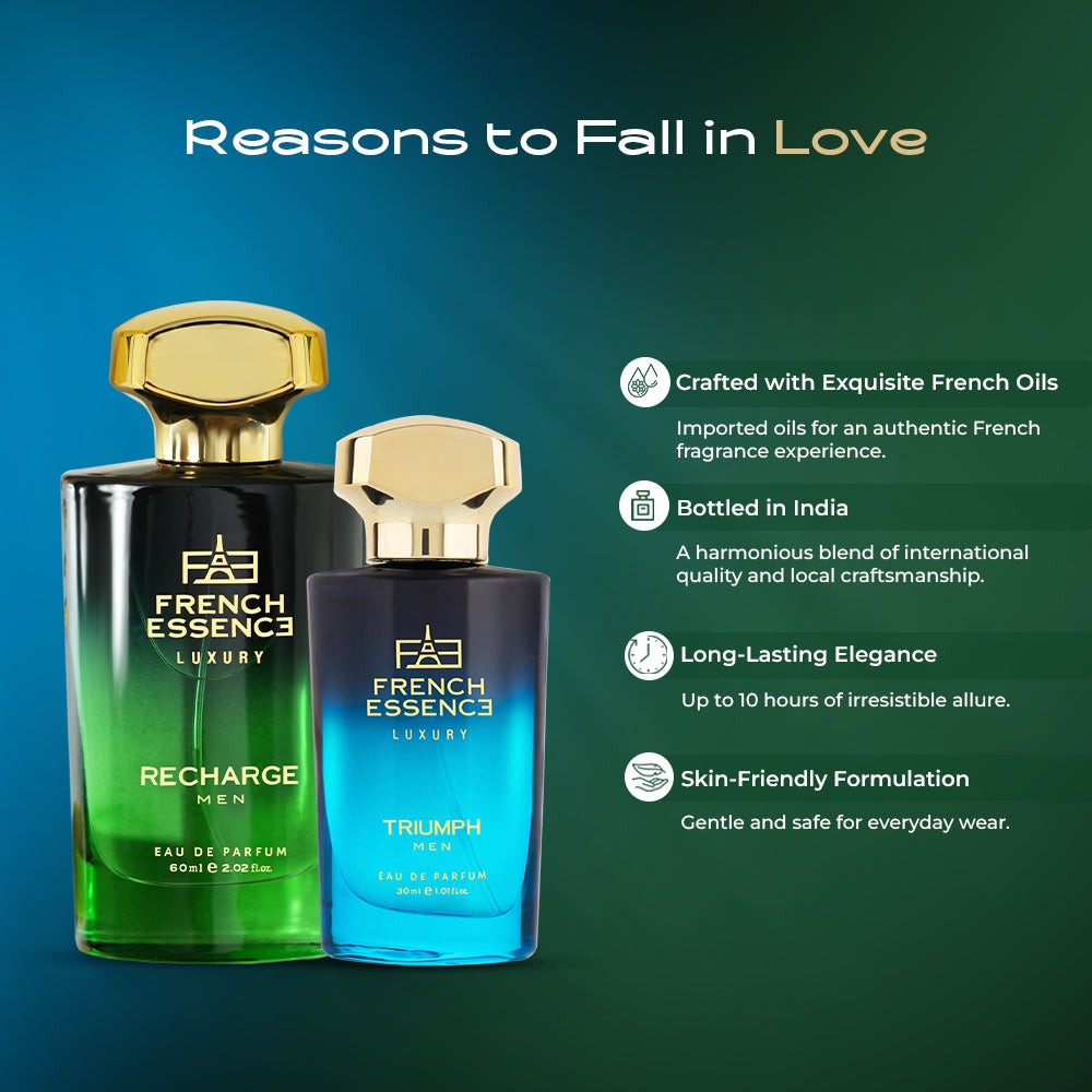 The "Triumph and Recharge" men's perfume combo by French Essence offers a powerful and invigorating fragrance experience.