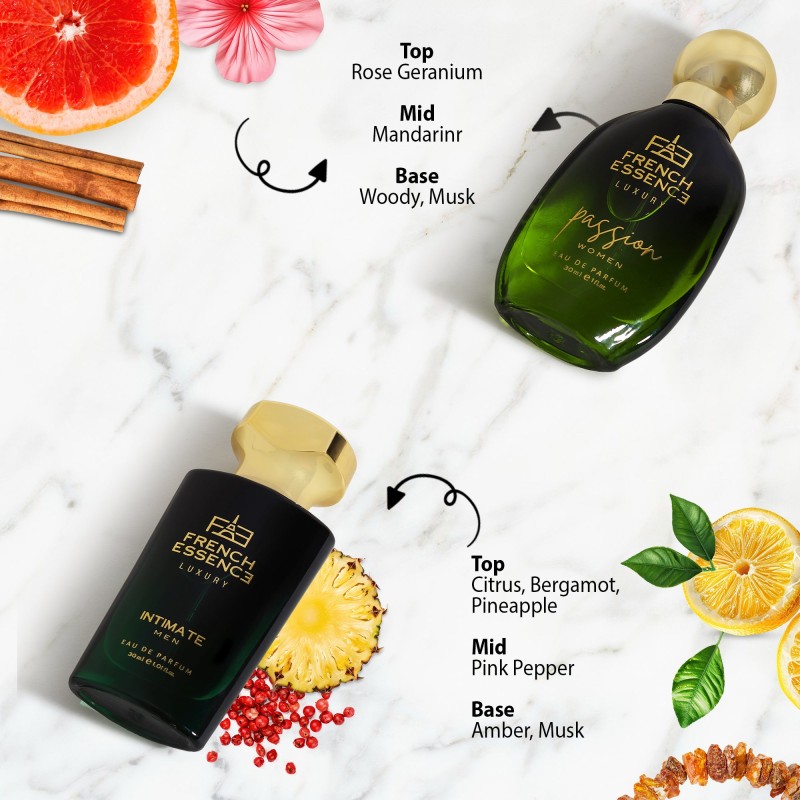 The Combo for Intimate and Passion by French Essence is a luxurious and alluring fragrance collection designed to evoke deep connection and irresistible attraction. This perfume set includes two captivating scents, one for men and one for women, each crafted to complement the other's essence.