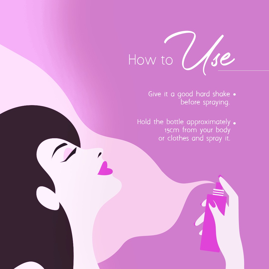 1. Hold the spray 4 to 5 inches from pulse points (neck, wrists, inside elbows, chest).