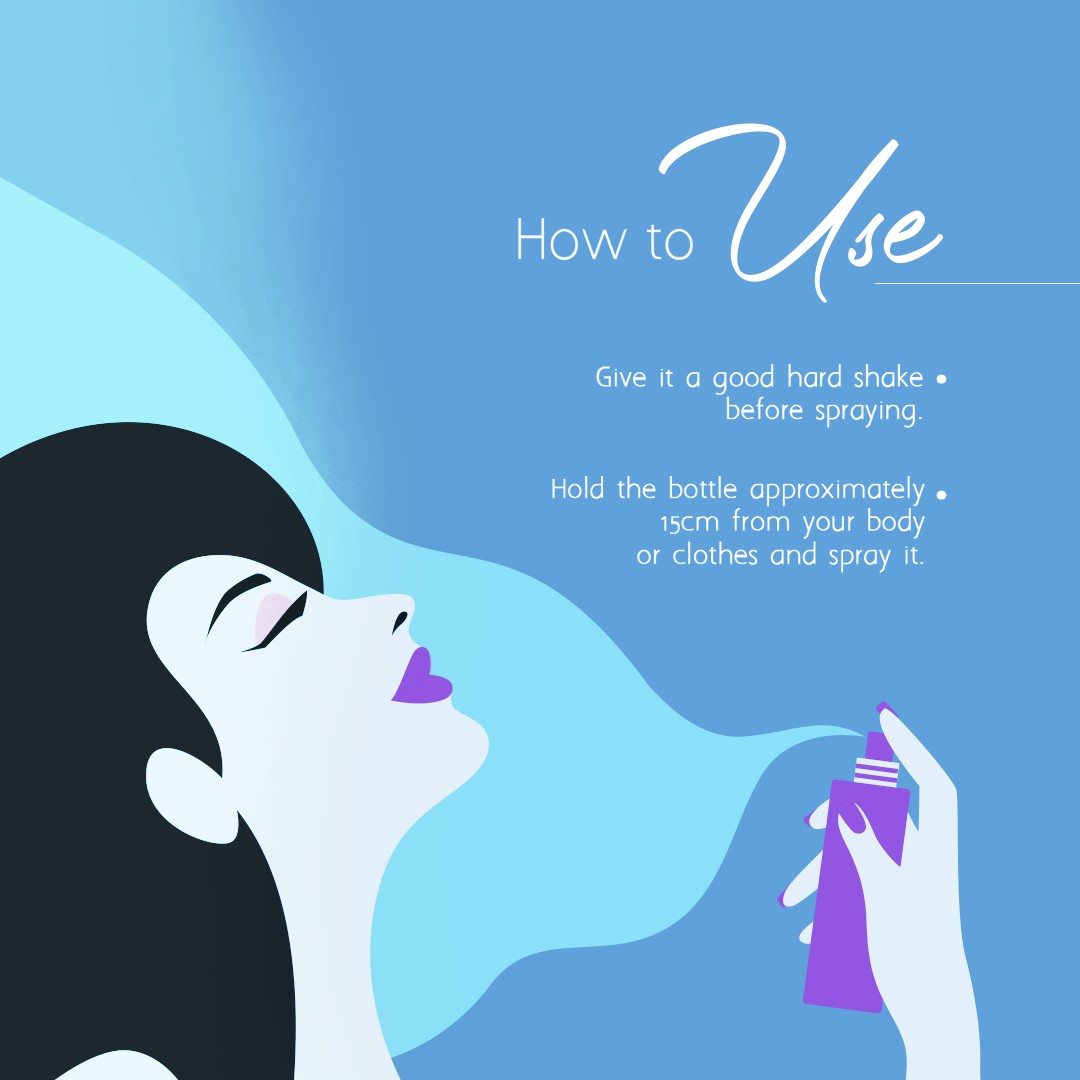 To use, shake the can well and spray it on pulse points such as the neck, wrists, and chest from a distance of 4 to 5 inches. Avoid rubbing the spray into the skin; let it absorb naturally.
