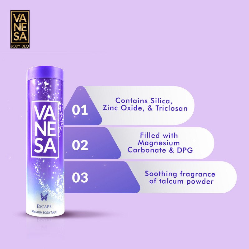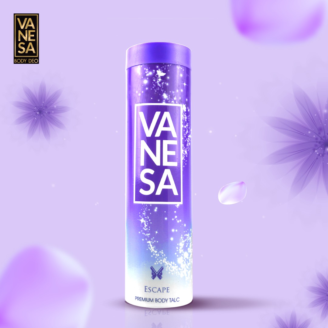 The Escape Talcum Powder 100 gm Combo VANESA is a premium body talc designed to keep your skin feeling smooth, soft, and silky. Infused with a rich French fragrance, it offers a long-lasting, invigorating scent throughout the day. The talc helps absorb sweat, preventing body odor and keeping your skin fresh. It also soothes and cools the skin, providing a refreshing sensation after application. This pack includes 100 gm bottles, ensuring you have an ample supply of this luxurious talcum powder.
