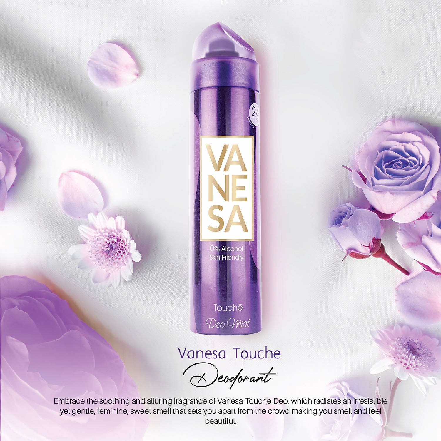 The Vanesa Touche, Whisper, and Tingle Deo Mists are alcohol-free, skin-friendly deodorants designed for women, offering 24-hour lasting protection. Each 150 ml mist provides a unique fragrance experience: