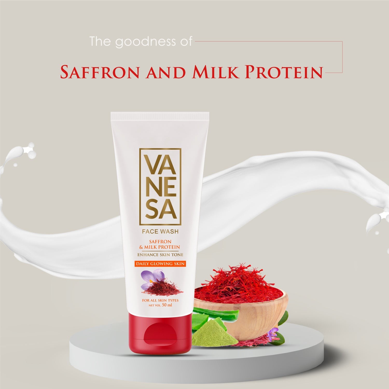 VANESA Face Wash Saffron & Milk Protein | Enhance Skin Tone | For Daily Glowing Skin | All Skin types | 50 ml